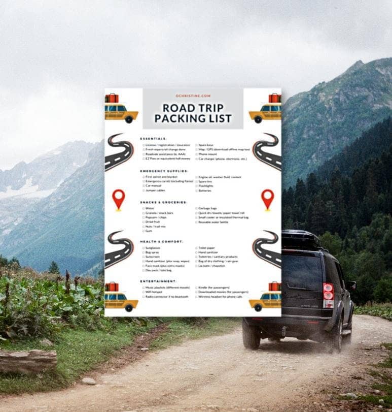 Access my 1-page road trip packing list (PDF). I've roadtripped across the USA many times with it!